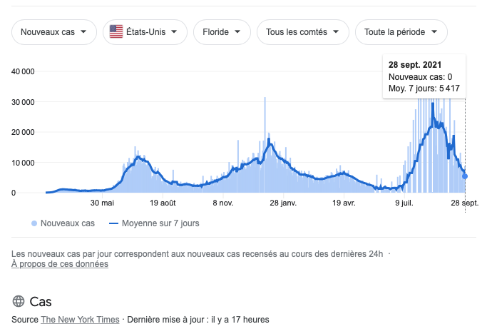 Au moment où cet article est rédigé (23 septembre 2021), en Floride une vague (variant Delta) était en train de baisser, et au Québec une vague était en train de monter. Il est ainsi possible de voir où en est la pandémie, même si – de notre point de vue – il est vain de vouloir comparer les différents pays.