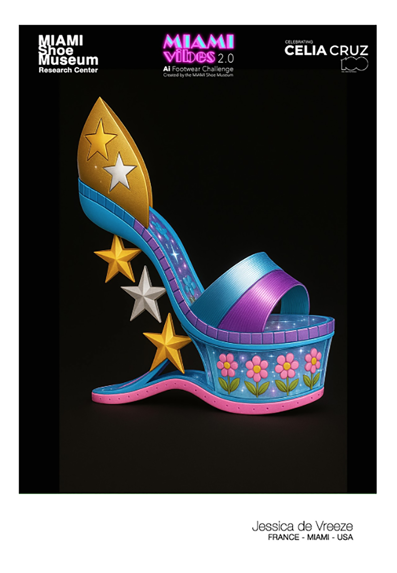 Jessica de Vreeze rejoint ainsi un cercle internationalement distingué de finalistes du Miami Vibe 2.0 Challenge, sélectionnés par un jury international sous l’égide du Miami Shoe Museum et de son fondateur Luis Valenzuela. Parmi eux : en duo, Wildy Martinez (New York) — créatrice primée qui associe intelligence artificielle, mode et identité — et l’artiste miamienne primée aux Emmy Awards Amaranta Martínez (Superama) ; ainsi que Franziska Hagenauer, designer de bio-structures basée en Allemagne ; Lucia Rabez, créatrice de chaussures basée à Buenos Aires ; et Sara Alimohamadi, architecte et designer en IA d’origine iranienne basée à Londres, lauréate d’une médaille d’or à l’IFIA Official et d’une médaille d’argent au SVLIF.