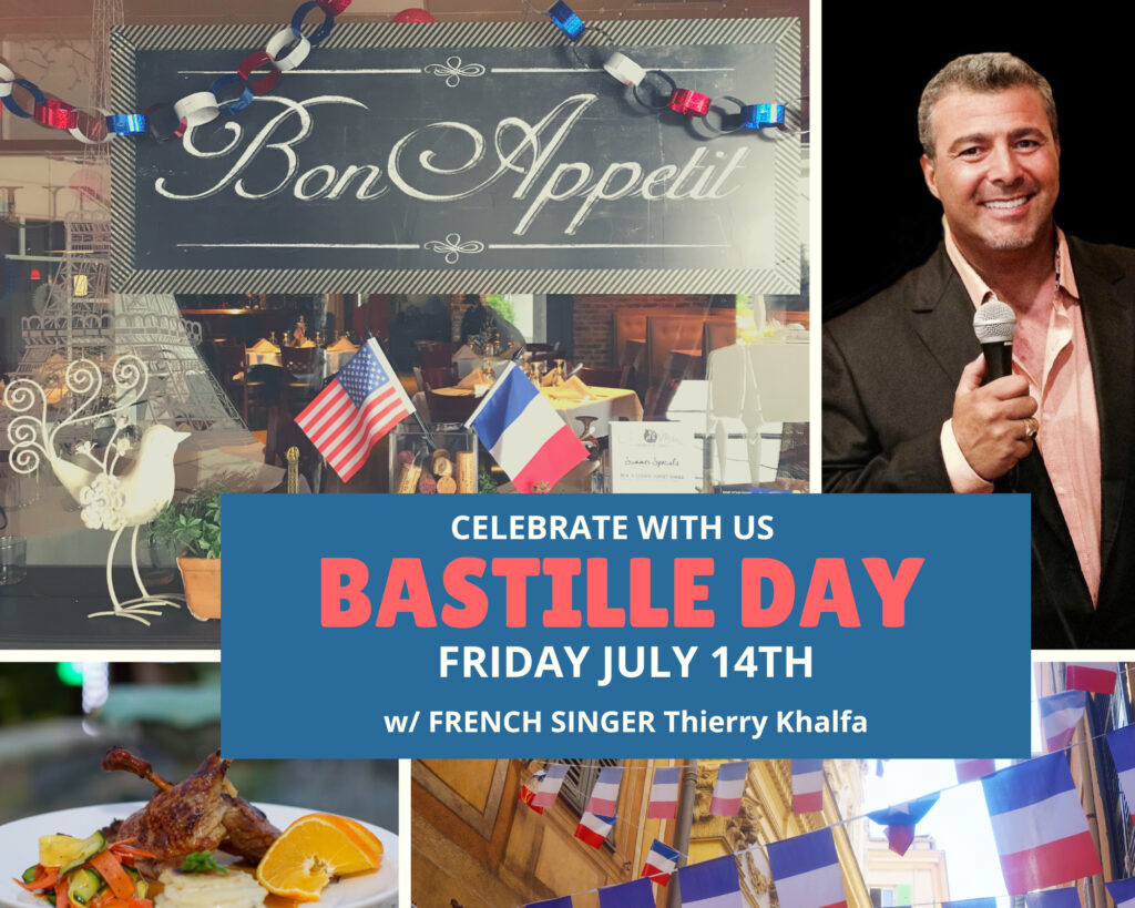 Célébration en français de Bastille Day en chansons avec le chanteur-animateur Thierry Khalfa le 14 juillet à partir de 17h. Vous trouverez tous les détails concernant le menu prix-fixe et la promo sur les vins maisons via le lien ci-dessous. A noter : dans la 2e moitié du mois d’août on fêtera les 10 ans de Chez Marie !